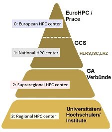 Levels 0 to 3 (it is also referred to as Tier - German: Stufe, Schicht -) reflect the increasing computing capacity and the increasing degree of parallelization of the simulation codes and the amount of data processed. At base level 3, there is a broader range of HPC computing systems for researchers and young scientists, who also receive increased support here.