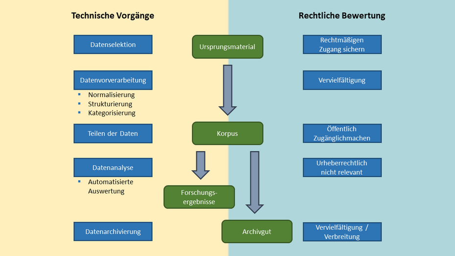 - Die automatisierte Auswertung des Korpus ist ebenfalls erlaubt, da sie keine urheberrechtlich relevante Nutzung darstellt.