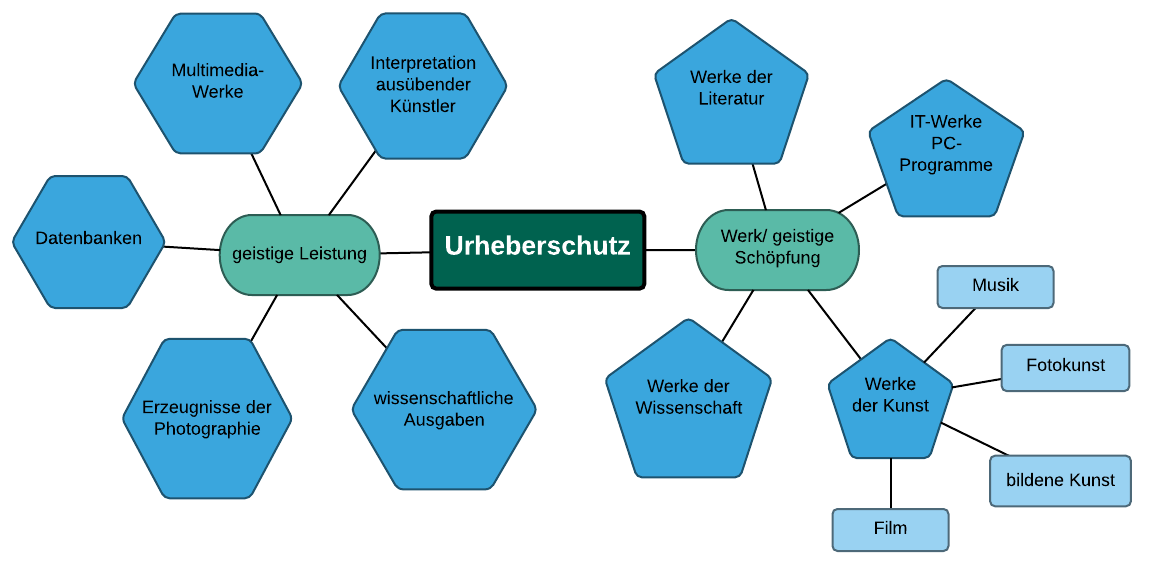 Das Urheberrecht (UrhG) schützt bestimmte geistige Schöpfungen und Leistungen (siehe Abb. 1). Dabei liegt der Schutzfokus bei der Geistesschöpfung auf dem entstandenen Werk insgesamt und bei den geistigen Leistungen auf dem Leistungsprozess. Eine Datenbank ist ein gutes Beispiel: werden viele Werke zusammengefasst, liegt oft keine Neuschöpfung vor (mangelnde Schöpfungshöhe). Es besteht kein neues Schutzrecht auf eines der Werke, aber womöglich auf die Leistung der Zusammenstellung.